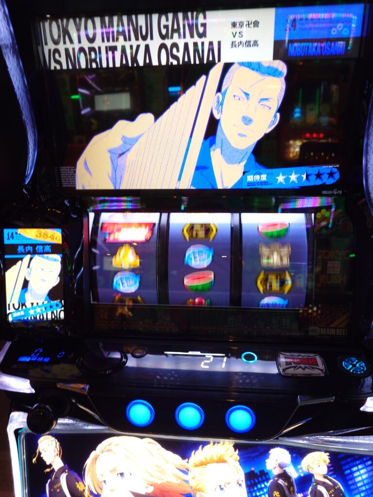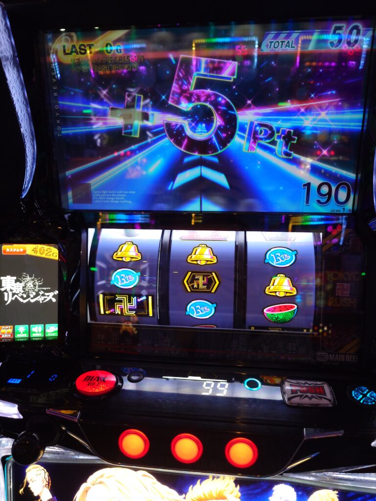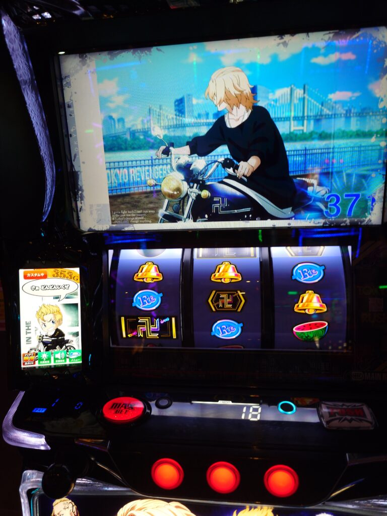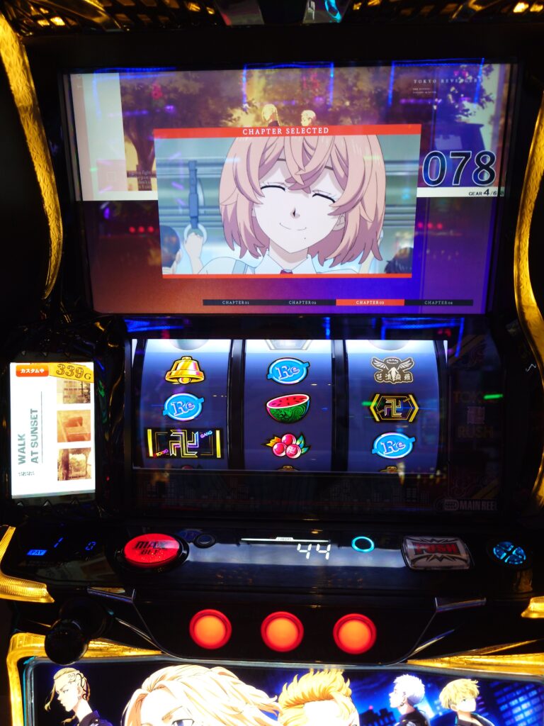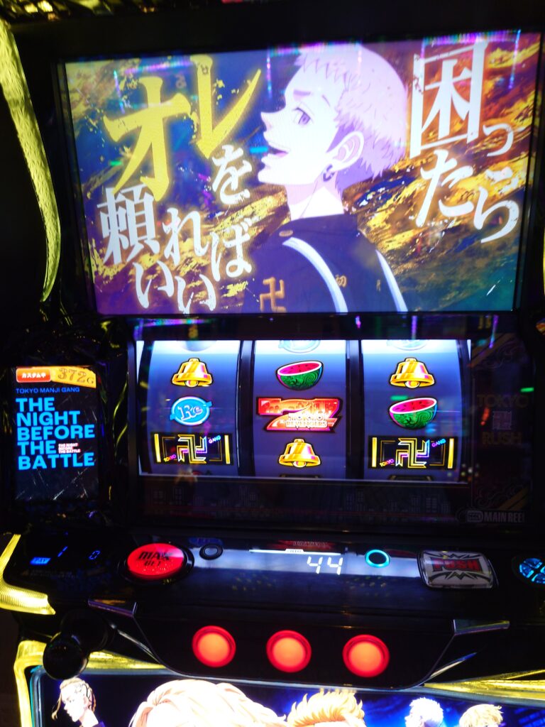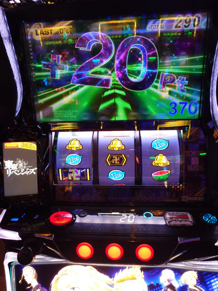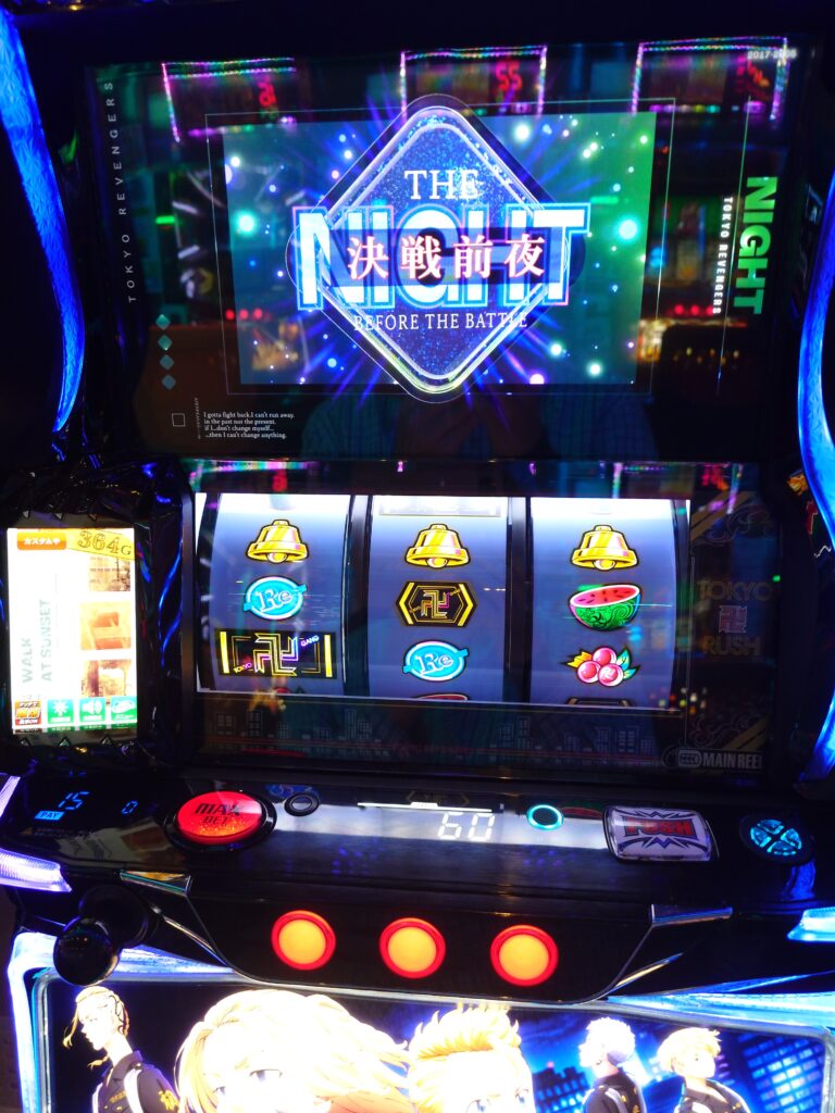 - 1台目:東京リベンジャーズを3周期目474の台を周期狙い→外れ→決戦前夜中弱チェ2回引いたので様子見でアクセル突入し290ポイント獲得→その前兆から東卍CHANCE当選→差枚数-153枚