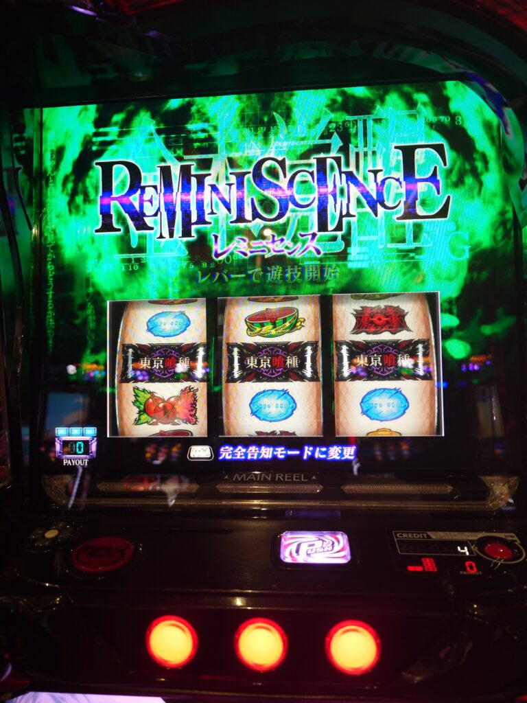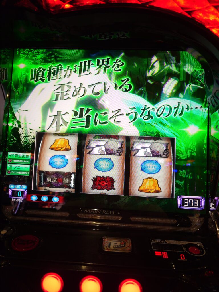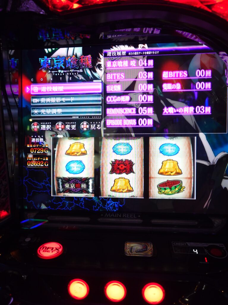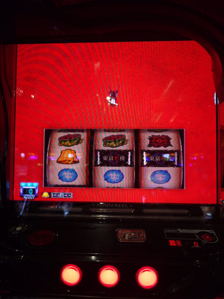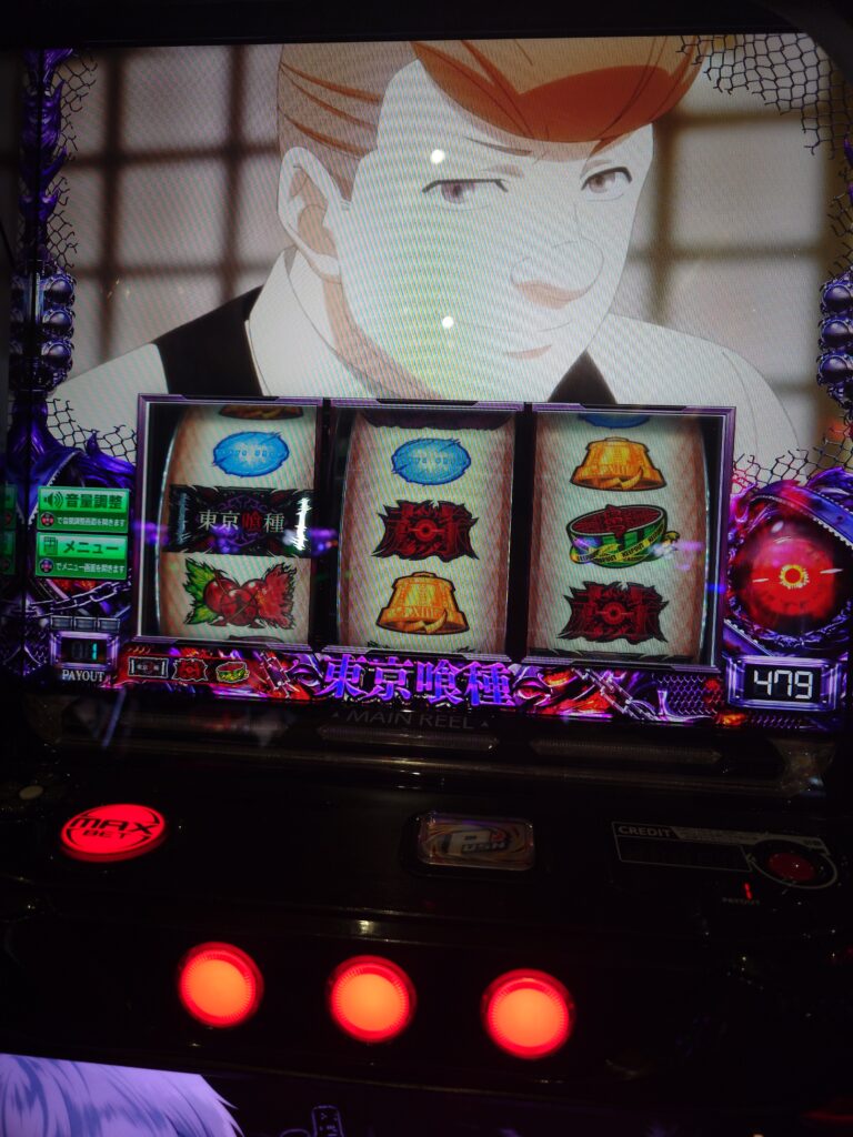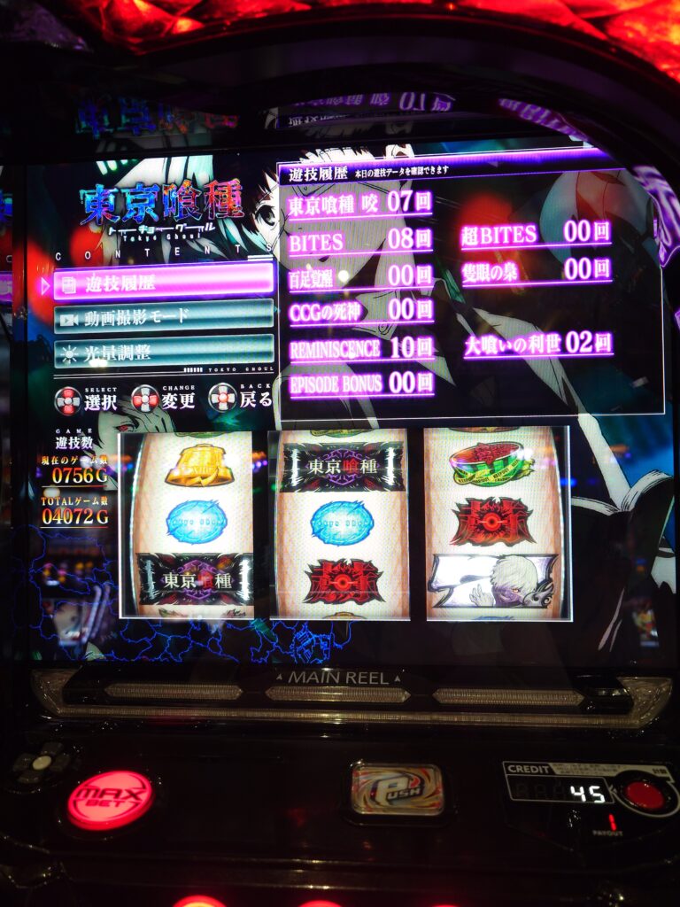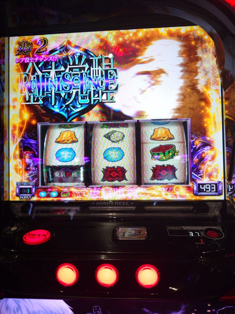 - 2台目:東京グール756Gの台を天井狙い→479ポイント弱チェリーから精神世界へ行ってレミニセンス当選→CZ中下段リプレイを引いてAT当選→BITESで300枚獲得→差枚数-24枚