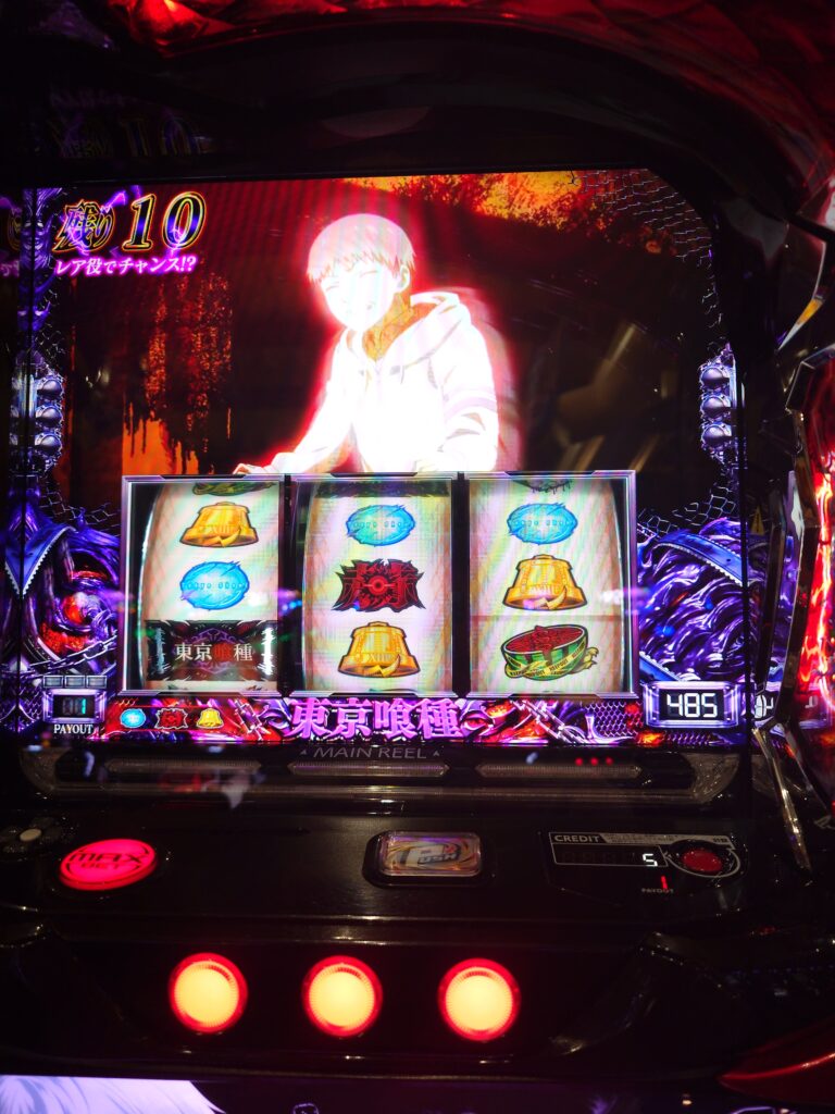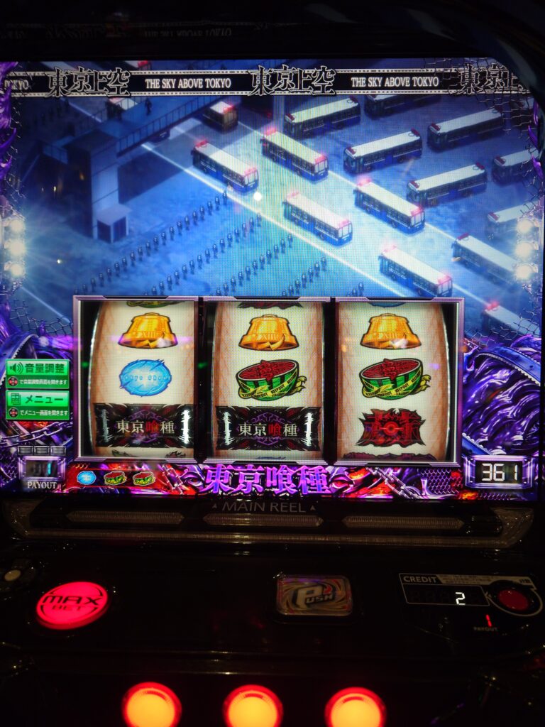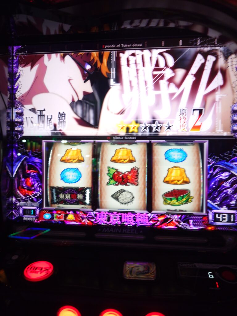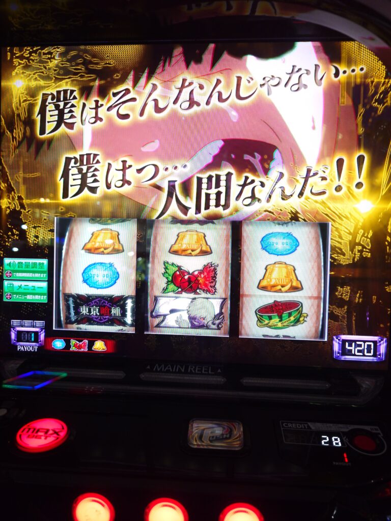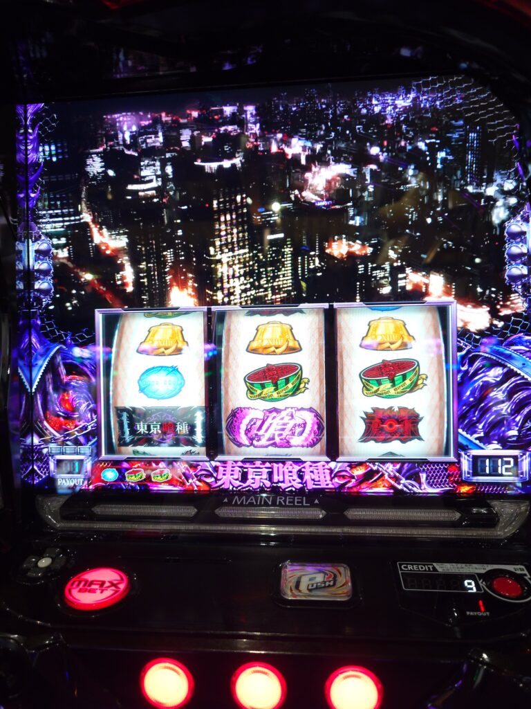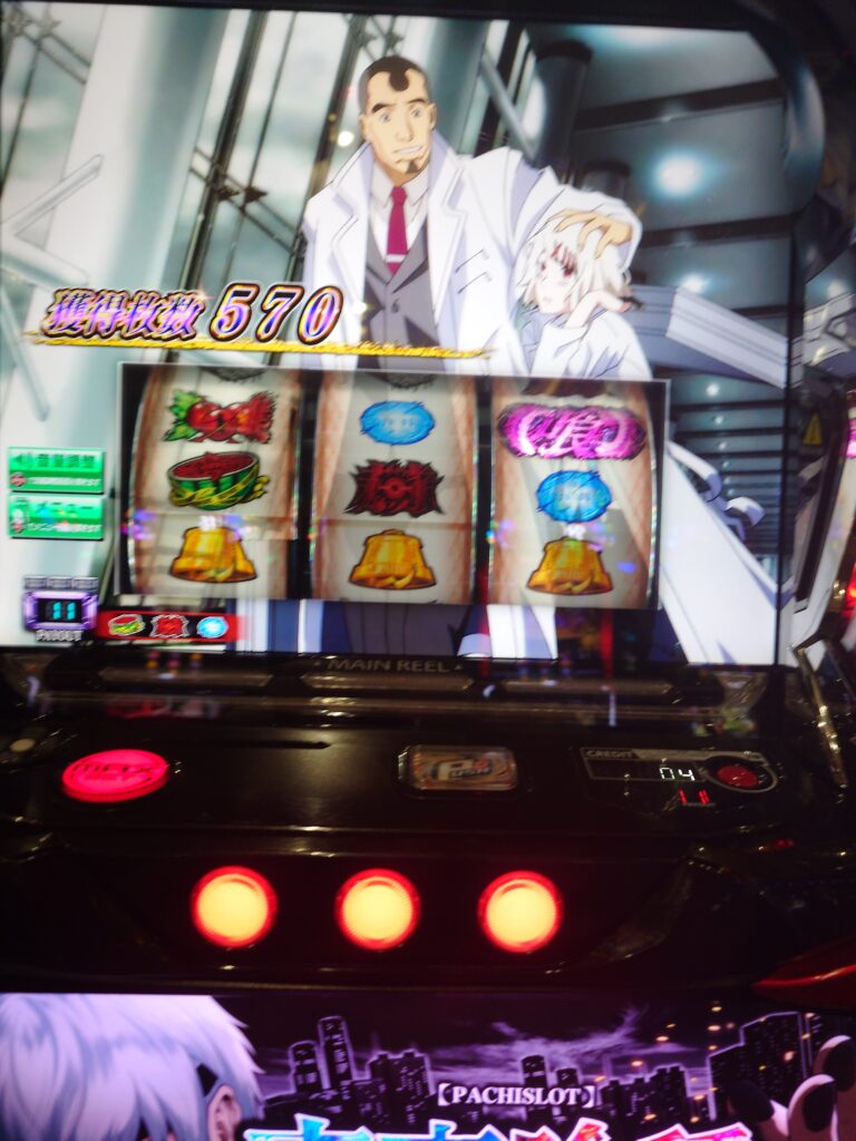 - 2台目:東京グール756Gの台を天井狙い→479ポイント弱チェリーから精神世界へ行ってレミニセンス当選→CZ中下段リプレイを引いてAT当選→BITESで300枚獲得→差枚数-24枚
